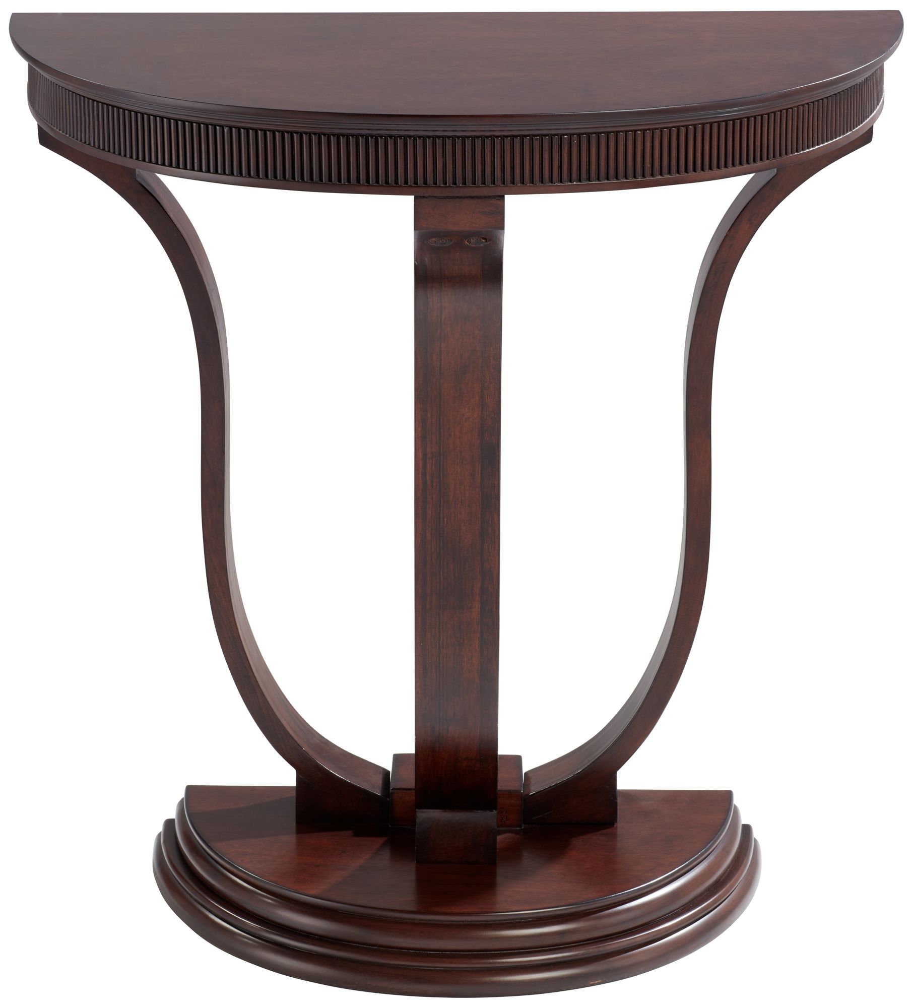 This demilune console table takes no half measures. Imagine it greeting guests in the entryway, dressing a blank living room wall or even providing storage in a home office. (half rounds) looks like a half circle and is used primarily as decorative trim. One may be used as an accent table for displaying accessories or other decorative items, or hold a small lamp in an area that needs additional lighting, such as a hallway or entryway. Tables / side tables / half round small console table.